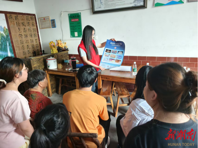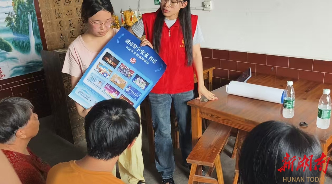“娭毑,您看这个平台里有好多老年康养知识,特别适合您。”在挽洲村活动现场,身着红马甲的实践团成员化身“宣传员”,通过海报展示和现场讲解,向村民全面介绍湖南数字农家书屋平台。 实践团成员指着海报介绍道。该平台涵盖少儿教育、老年康养、助农技术等多领域电子资源,村民用手机、平板就能便捷获取知识,随时随地享受阅读乐趣,提升文化素养与实用技能。